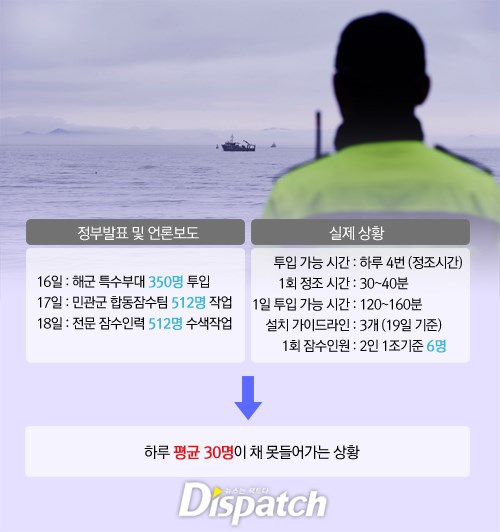 민간협회 관계자는 "현장 수백 명의 다이버가 있어도 그들 모두 수색에 뛰어들 수 없다"면서 "해경이 발표하는 투입이란, 대기 인원가지 포함한 것 같다. 산술적으로 하루에 최대 30명이 수색하기도 힘든 환경"이라고 설명했다.
