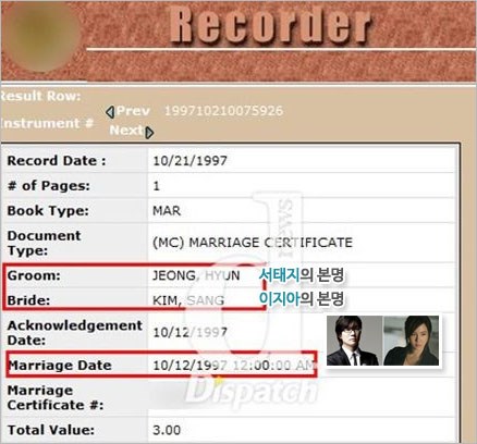 그리고 결혼한 시기는 1997년 10월 21일이다. 이는 '디스패치'가 미국 법원에서 입수한 결혼 증명서를 통해서도 확인할 수 있다.