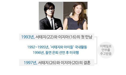 D : 두 사람이 다시 만난 건 1996년이다. 그리고 다음 해인 1997년 10월 21일 부부가 됐다. 이때, 이지아의 나이는 20세, 서태지는 26세다.