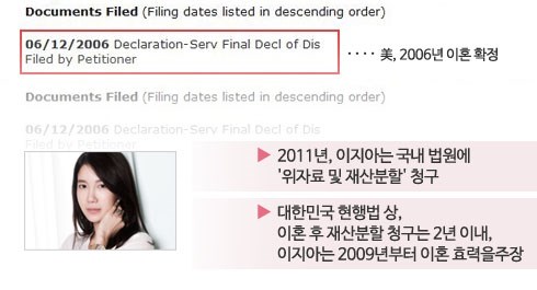 D : 미국 법원의 판결을 기준으로 삼는다면, 이지아가 2011년에 제기한 '위자료 및 재산분할' 청구소송은 무효다. 2006년 이혼 시점에서 이미 5년이 지났기 때문이다.
