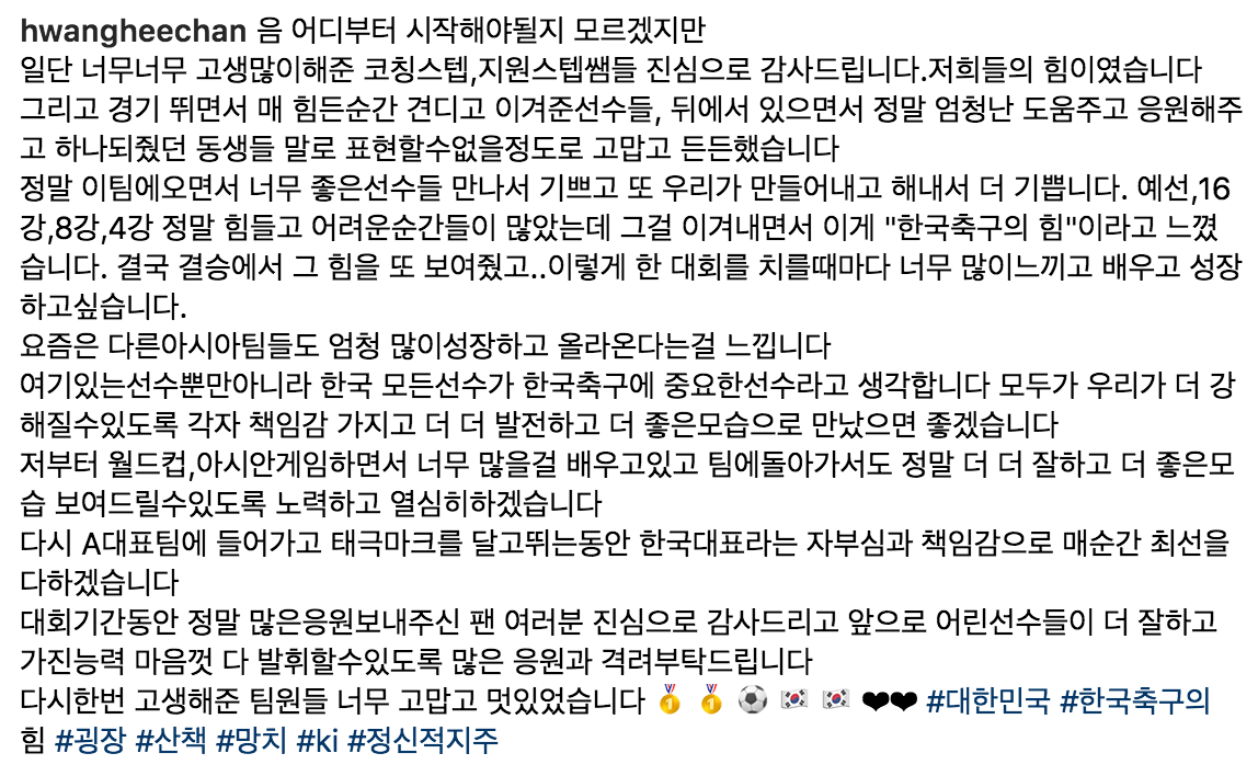 그다음 날, 황희찬 선수는 인스타그램 계정을 공개로 전환했습니다. 몇 장의 사진과 함께 국민과 팬들에게 감사 인사를 전했는데요.