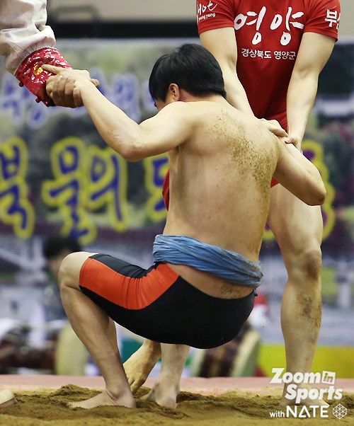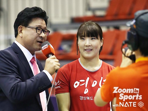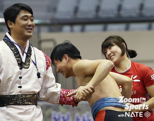 실제 중계 때 전국에 생방송된 장면들이다. '여자 이만기' 임수정과 '남자의 자존심' 신승대 아나운서가 펼친 '성대결 씨름' 특별 이벤트, '2014 대통령배 전국씨름왕선발대회'의 지난 9일 오후, 안동실내체육관이었다.