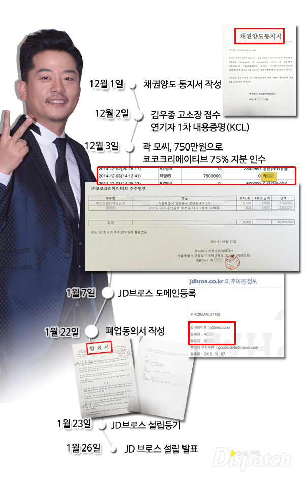 우연의 일치는 또 있다. 1월 7일, JD브로스의 도메인을 등록한 사람은 곽 모씨. 그는 '코코크리에이티브' 대표다. 김준호와 캐릭터 MD 사업을 함께 하는 친구다.