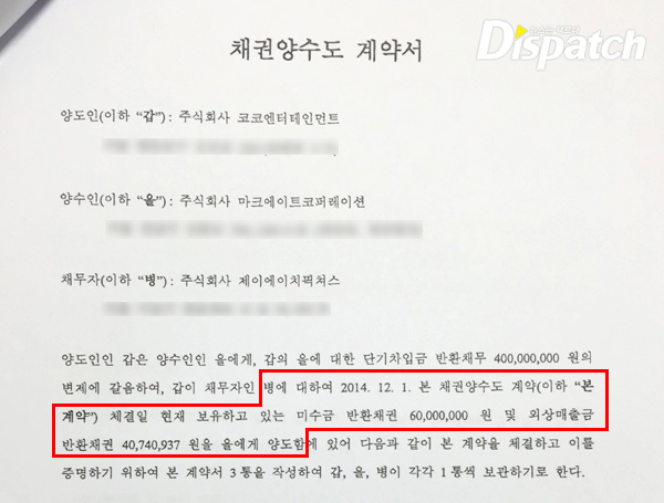그렇다면 김준호는 왜 적금을 깼고, 또 4억을 빌렸다고 말했을까? 아래 김준호(JH픽쳐스)가 코코 및 마크 등과 작성한 '양도채권통지서'를 보면, 윤곽이 나온다.