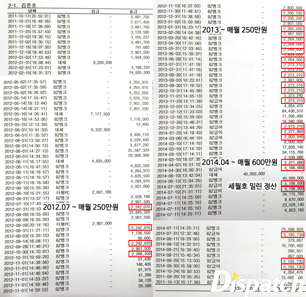 법인 통장 확인 결과, 김준호는 2012년 7월부터 매달 월급을 수령하고 있었다. 12년 7월부터 14년 3월까지는 250만 원, 이후로는 600만 원이다.