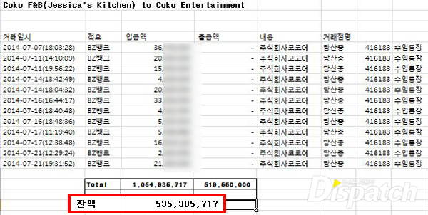 심지어 '제시카 키친'의 5개월(7월~12월) 매출 10억 5,000만 원 중 5억 3,500만 원을 코코엔터 운영에 사용했다.