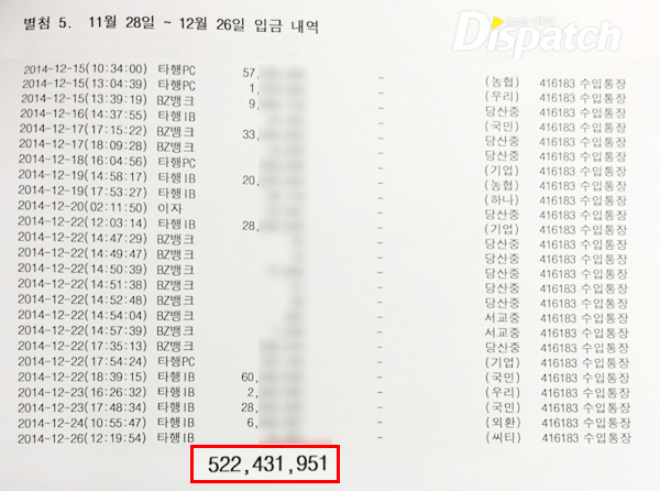 아이러니한 것은, 11월 28일에서 12월 26일까지 4억 2,000만 원이 다시 입금됐다는 사실. 소속 연예인의 미지급금 일부를 정산할 수 있는 금액이다.