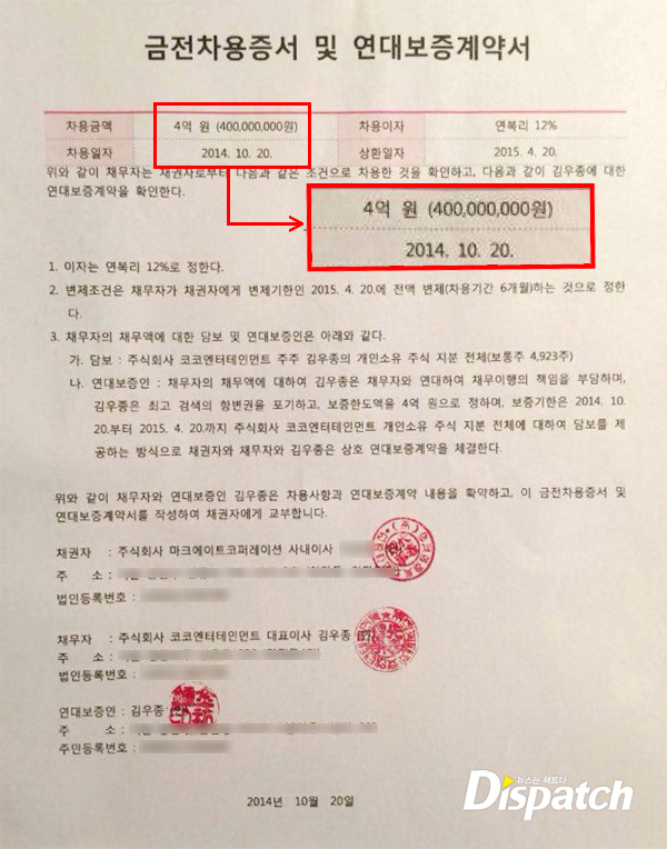 김우종 대표는 지난 해 10월 20일, '마크에이트코퍼레이션'으로부터 4억 원을 빌렸다. 만기일은 2015년 4월 20일. 자신의 코코엔터 지분을 모두 맡기는 조건이었다.