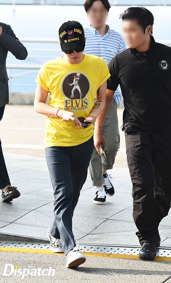 월드투어 공연을 위해 출국장에 모습을 드러낸 지드래곤은 독특한 컨셉의 의상으로 개성을 뽐냈다. 앞서가는 패션감각에도 변하지 않는 공항템이 인상적이었다.