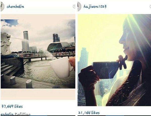 여기에 비슷한 시기에 싱가포르에 방문하기도 함. 두 사람은 같은 장소에서 커피잔을 들고 인증샷을 찍음.