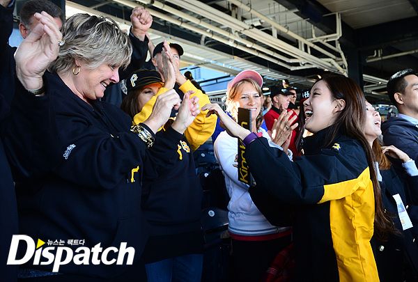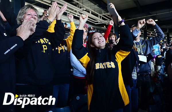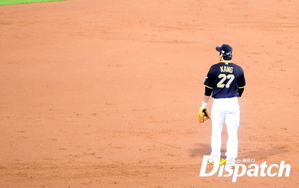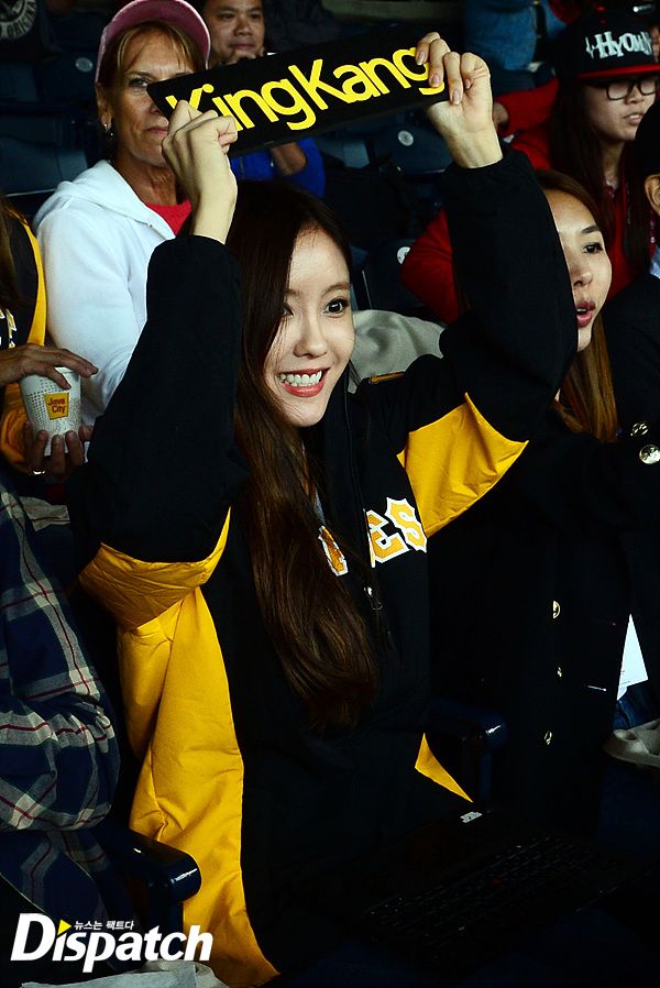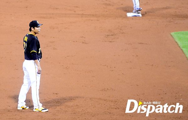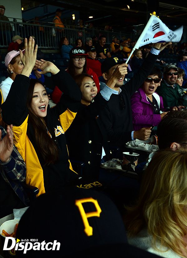 강정호는 3루석으로 향했습니다. 팬들은 '킹캉'을 바라봅니다. 그러나 강정호는 '효민'에게 손을 내밀었습니다.