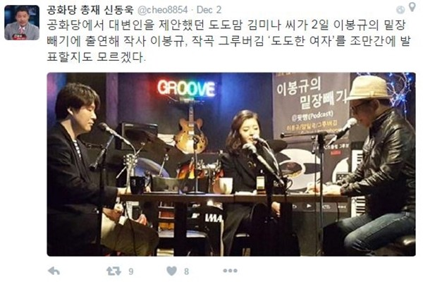 신동욱은 "도도맘 김미나가 2일 이봉규의 밑장빼기에 출연했다"며 "작사 이봉규, 작곡 그루버김의 도도한 여자를 조만간 발표할지도 모르겠다"는 글을 올렸습니다.