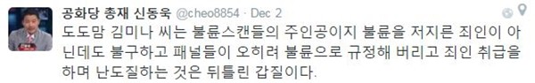 강용석 스캔들을 옹호하기도 했는데요. "김미나는 불륜스캔들의 주인공일 뿐. 불륜을 저지른 죄인이 아니다. 죄인 취급을 하는 것은 뒤틀린 갑질이다"라는 입장을 전했습니다.