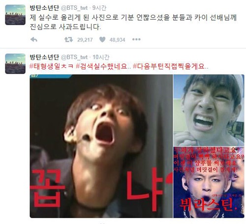 '방탄소년단' 랩몬스터가 SNS 도중 깜짝 실수를 했습니다. '엑소' 카이의 엽기 사진을 잘못 올린 것을 깨닫고, 사과했습니다.