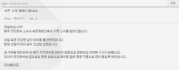 소속사 '문화창고'는 10일 공식 홈페이지에 "전지현이 이날 오전 건강한 남자 아이를 출산했다"며 "현재 산모와 아이 모두 건강한 상태다"라고 밝혔다.