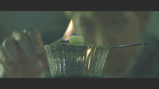 ▶ 장면 3. 뮤비 1분 40초. 랩몬스터는 설탕과 새그림을 태운다. 그리고 이를 넣은 초록색 술을 마신다. 2분 17초. 정국이 술을 손으로 맛본다. 2분 59초 사탕을 먹는다.