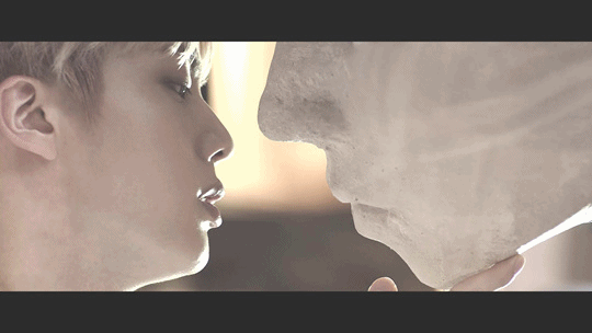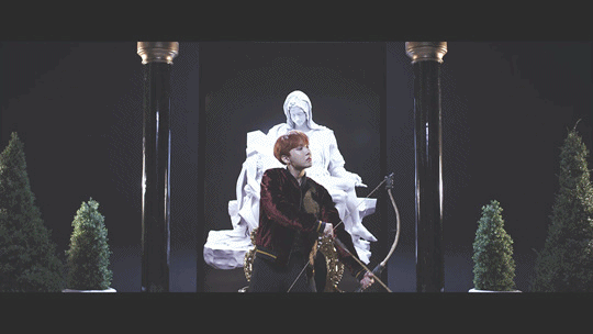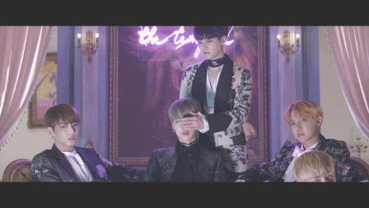 ▶ 장면 2. 뮤비 55초. 슈가는 앉은 지민의 눈을 손으로 가린다. 3분 50초, 슈가가 지민의 눈을 검은띠로 가린다. 5분 25초, 진이 검은 날개를 단 조각상에 입맞춘다.