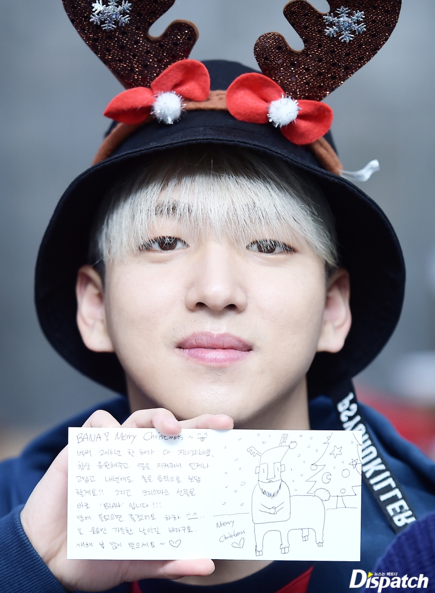 "벌써 2016년 한 해가 다 지나갔네요. 항상 응원해주고 옆을 지켜줘서 언제나 고맙고요. 내년에도 좋은 음악으로 보답할게요. 그리고 크리스마스 선물은 바로 'B1A4'입니다. 마음에 들었으면 좋겠어요. 하하. 늘 웃음만 가득한 날이길 바라구요. 새해 복 많이 받으세요 ♡" (바로)