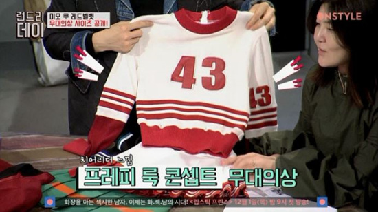 스타일리스트 한혜연은 "치어리더 느낌의 의상이다. 프레피 룩을 콘셉으로 잡은 듯 하다"며 의상에 대한 평을 내놓았죠.