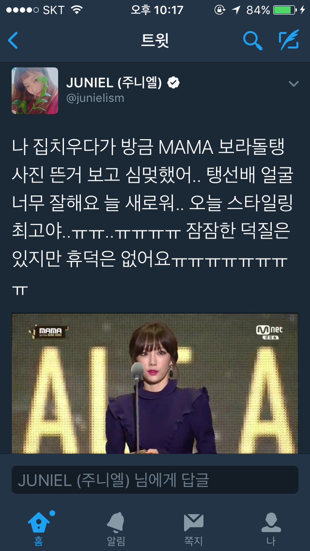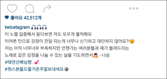 트와이스 공식 인스타그램에 태연의 '비밀' 추천글을 올리기도 했죠. "태연선배님 짱"이라며 "이어폰 만으로 감정이 전달되는게 너무 신기하고 대단하다"고 극찬했습니다.