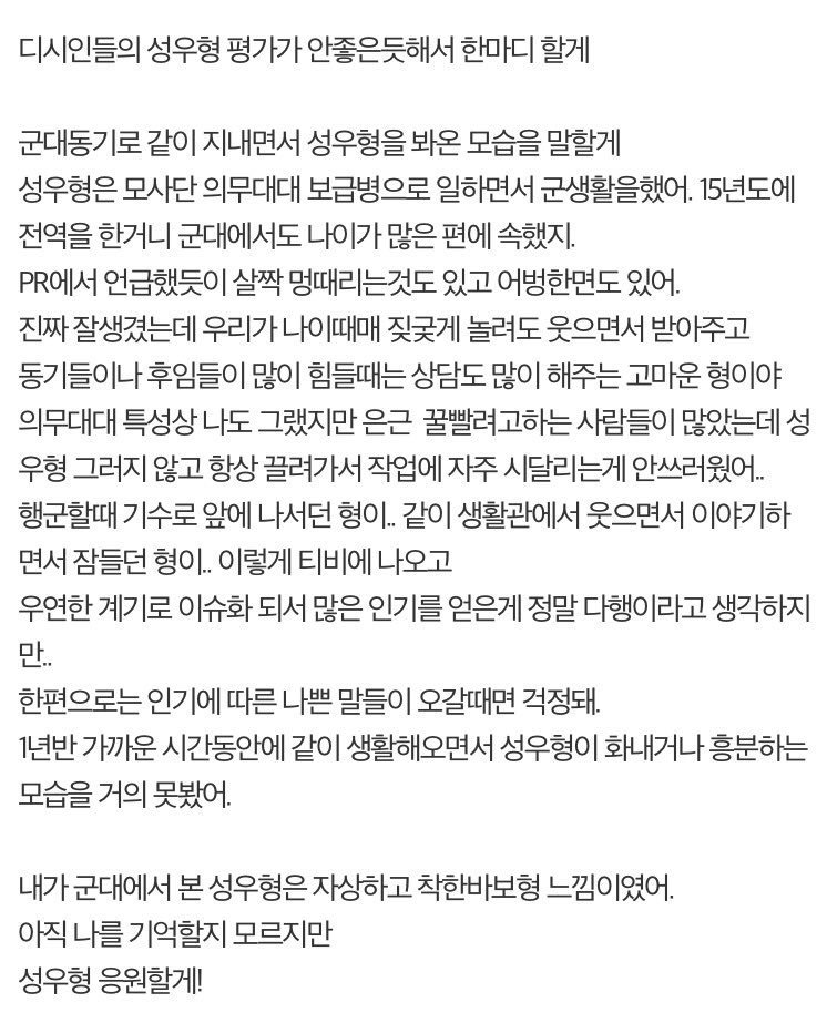 한 네티즌은 자신이 박성우의 군대 후임이라고 밝혔는데요. "종종 멍 때리기도 하고, 어벙한 면도 있다. 하지만 동기들이나 후임들이 힘들어할 땐 상담 해줬다"고 말했습니다.