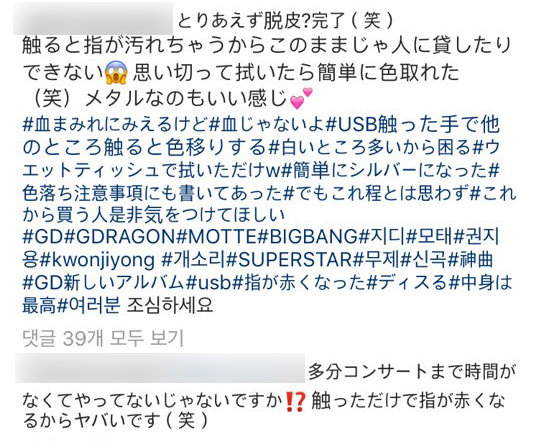이 팬에 따르면, GD의 USB를 만지면 손에 붉은 염료가 진하게 묻어납니다. 물티슈로 USB를 닦아냈더니 색이 벗겨졌습니다.