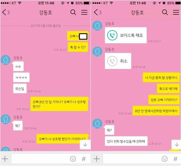 지인에게 카카오톡으로 연락이 온 것을 보고 답변을 한 강동호군에게 상대방은 곧바로 성추행을 당했다는 당황스러운 주장을 하였고, 이에 강동호군이 보이스톡을 요청했습니다.