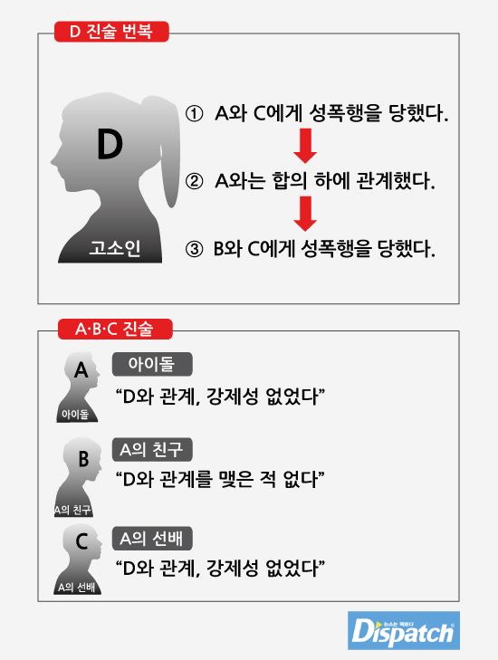 D는 아이돌 A와 일반인 C에게 강간을 당했다고 말했다. 그러다 A는 강제성이 없었다고 말을 바꿨다. 대신 B와 C가 자신을 성폭행했다고 주장했다.