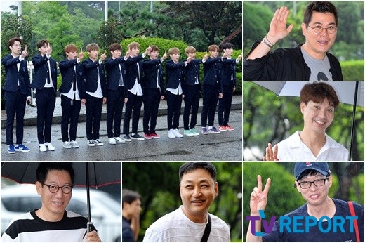 그룹 워너원, 개그맨 김용만, 박수홍, 유재석, 김수용, 지석진(왼쪽 위부터 시계방향)이 28일 오전 서울 영등포구 여의도동 KBS별관에서 열린 KBS2 '해피투게더3' 녹화에 참석하고 있다.