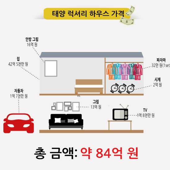 여기에 태양까지 가세했습니다. 태양의 럭셔리 라이프를 소화하려면요? 약 84억 원이 든다고 합니다.