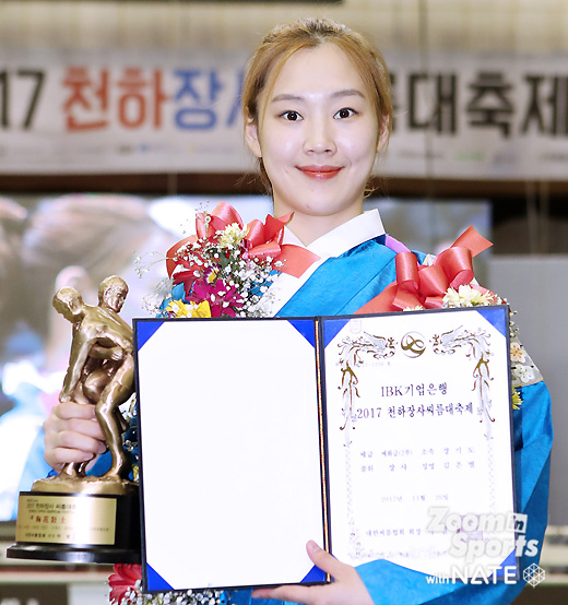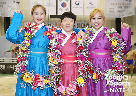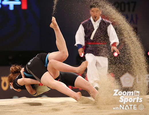 높아가는 '여자씨름 인기' 그리고 '우먼파워' 현장. 지난 24일과 25일 오후, 'IBK기업은행 2017 천하장사씨름대축제' 여자부 체급별 및 여자천하장사 결승전의 전남 나주스포츠파크 다목적체육관이었다. 취업에 성공한 '씨름얼짱' 김은별(왼쪽)에게 축하의 마음을 전하는 바다.