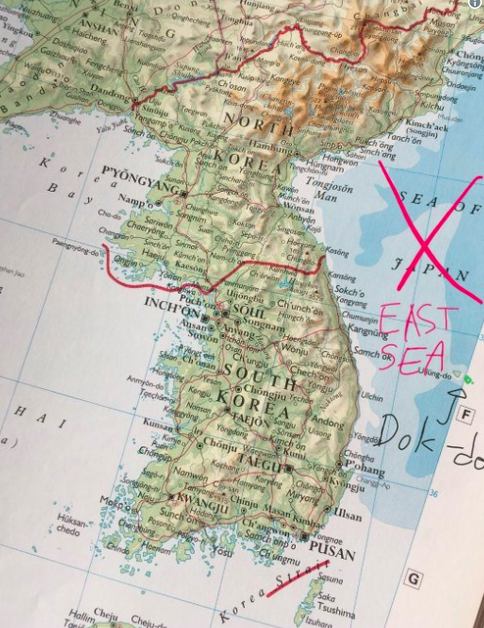 사진은 다름 아닌 지도였습니다. 일본해(Sea of Japan)이라고 표시돼 있었는데요. 직접 빨간색으로 엑스 자를 표시한 뒤, 아래에 ‘동해’(East Sea)라고 적었습니다.