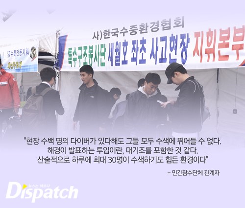 민간협회 관계자는 "현장 수백 명의 다이버가 있어도 그들 모두 수색에 뛰어들 수 없다"면서 "해경이 발표하는 투입이란, 대기 인원가지 포함한 것 같다. 산술적으로 하루에 최대 30명이 수색하기도 힘든 환경"이라고 설명했다.