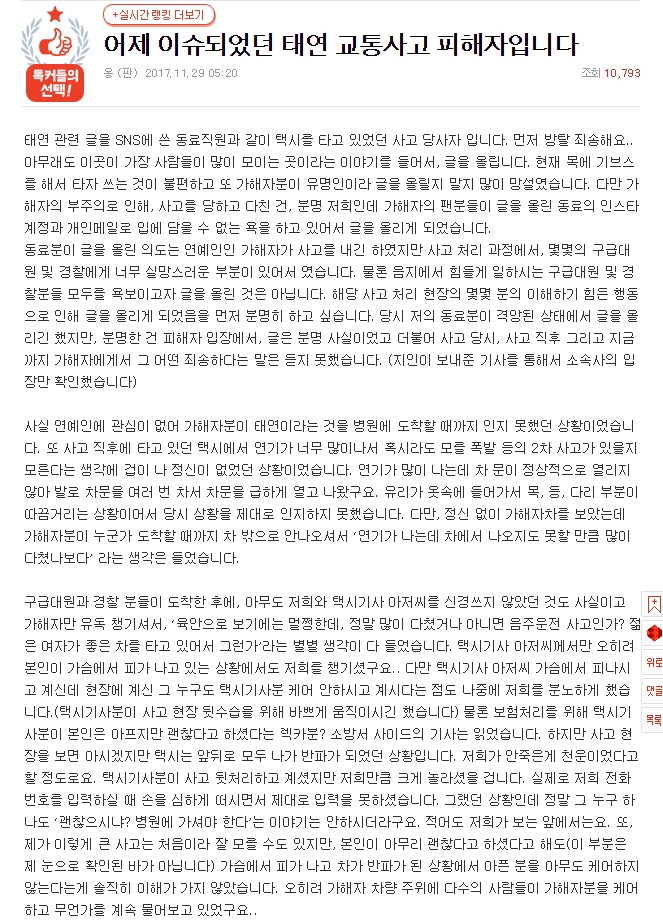 태연 관련 글을 SNS에 쓴 동료직원과 같이 택시를 타고 있었던 사고 당사자 입니다. 먼저 방탈 죄송해요.. 아무래도 이곳이 가장 사람들이 많이 모이는 곳이라는 이야기를 들어서, 글을 올립니다. 현재 목에 기브스를 해서 타자 쓰는 것이 불편하고 또 가해자분이 유명인이라 글을 올릴지 말지 많이 망설였습니다. 다만 가해자의 부주의로 인해, 사고를 당하고 다친 건, 분명 저희인데 가해자의 팬분들이 글을 올린 동료의 인스타 계정과 개인메일로 입에 담을 수 없는 욕을 하고 있어서 글을 올리게 되었습니다.
