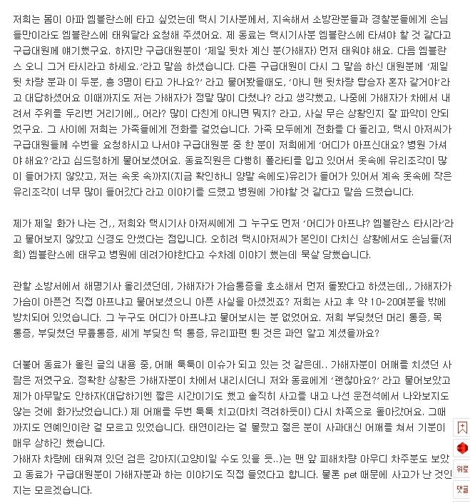 제가 제일 화가 나는 건,, 저희와 택시기사 아저씨에게 그 누구도 먼저 ‘어디가 아프냐? 엠블란스 타시라’라고 물어보지 않았고 신경도 안썼다는 점입니다. 오히려 택시아저씨가 본인이 다치신 상황에서도 손님들(저희) 엠블란스에 태우고 병원에 데려가야한다고 수차례 이야기 했는데 묵살 당했습니다.