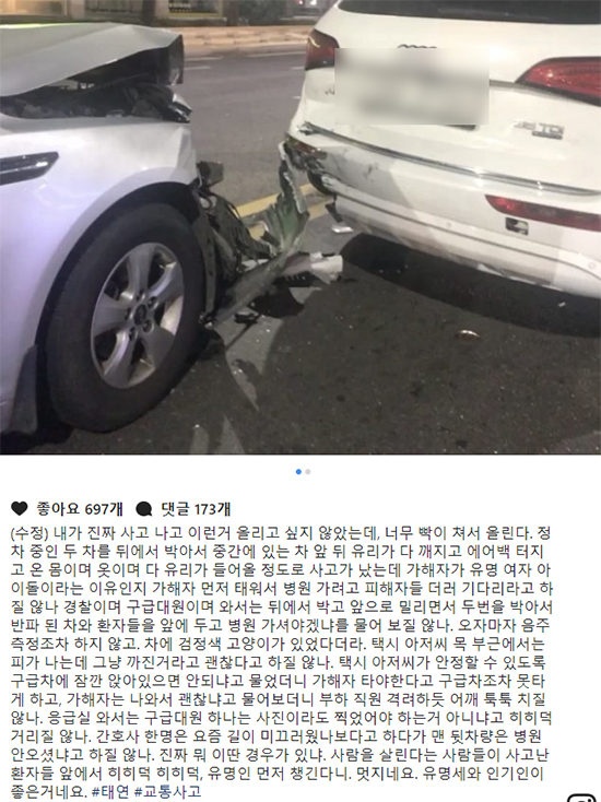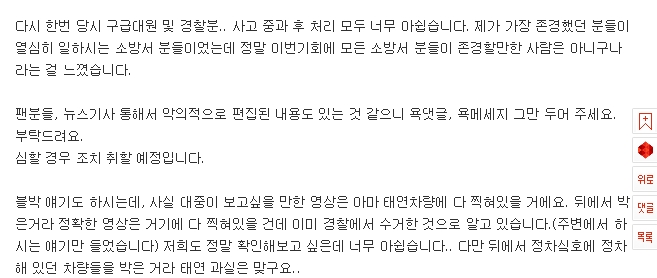 동료분이 글을 올린 의도는 연예인인 가해자가 사고를 내긴 하였지만 사고 처리 과정에서, 몇몇의 구급대원 및 경찰에게 너무 실망스러운 부분이 있어서 였습니다. 물론 음지에서 힘들게 일하시는 구급대원 및 경찰분들 모두를 욕보이고자 글을 올린 것은 아닙니다. 해당 사고 처리 현장의 몇몇 분의 이해하기 힘든 행동으로 인해 글을 올리게 되었음을 먼저 분명히 하고 싶습니다. 당시 저의 동료분이 격앙된 상태에서 글을 올리긴 했지만, 분명한 건 피해자 입장에서, 글은 분명 사실이었고 더불어 사고 당시, 사고 직후 그리고 지금까지 가해자에게서 그 어떤 죄송하다는 말은 듣지 못했습니다. (지인이 보내준 기사를 통해서 소속사의 입장만 확인했습니다)
