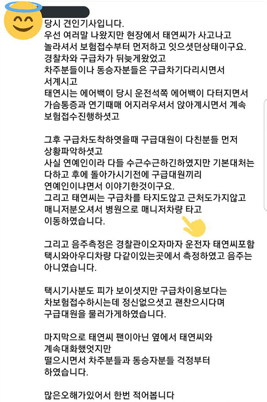 마지막으로 그는 "태연은 계속 떨면서 차주와 동승자분들 걱정부터 하고 있었다"고 설명했죠.