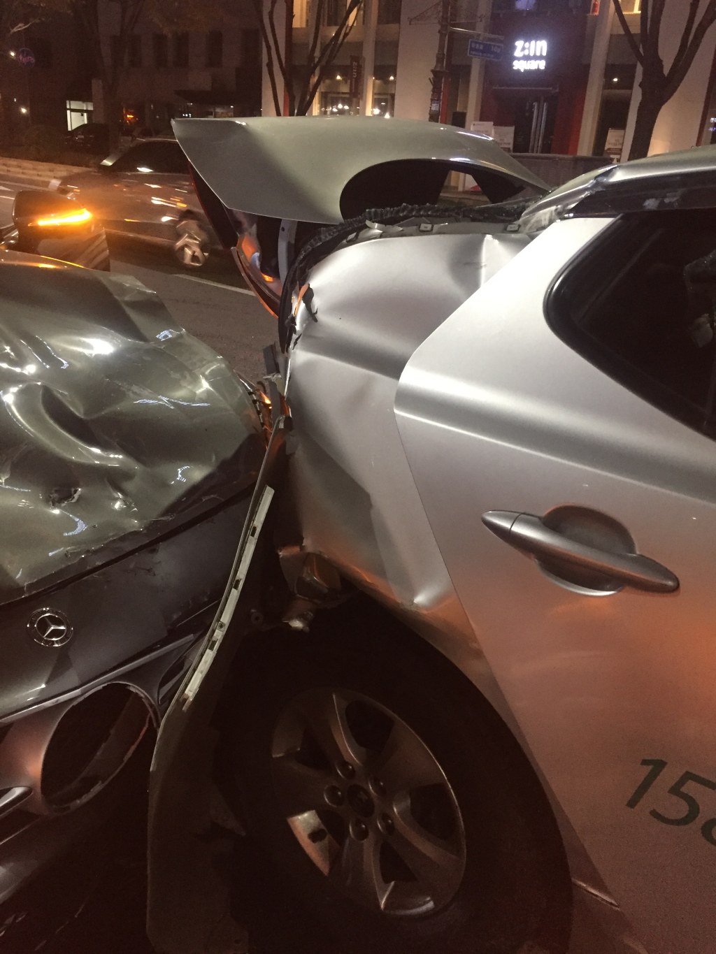 하지만 사고 현장을 보면 아시겠지만 택시는 앞뒤로 모두 나가 반파가 되었던 상황입니다. 저희가 안죽은게 천운이었다고 할 정도로요. 택시기사분이 사고 뒷처리하고 계셨지만 저희만큼 크게 놀라셨을 겁니다. 실제로 저희 전화번호를 입력하실 때 손을 심하게 떠시면서 제대로 입력을 못하셨습니다. 그랬던 상황인데 정말 그 누구 하나도 ‘괜찮으시냐? 병원에 가셔야 한다’는 이야기는 안하시더라구요. 적어도 저희가 보는 앞에서는요. 또, 제가 이렇게 큰 사고는 처음이라 잘 모를 수도 있지만, 본인이 아무리 괜찮다고 하셨다고 해도(이 부분은 제 눈으로 확인된 바가 아닙니다) 가슴에서 피가 나고 차가 반파가 된 상황에서 아픈 분을 아무도 케어하지 않는다는게 솔직히 이해가 가지 않았습니다. 오히려 가해자 차량 주위에 다수의 사람들이 가해자분을 케어하고 무언가를 계속 물어보고 있었구요..