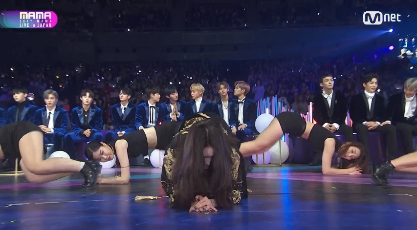 뒤에는 남자 아이돌들이 앉아있었습니다. 이에 '워너원'과 '엑소'는 춤추는 청하의 뒷모습을 보게 됐는데요.