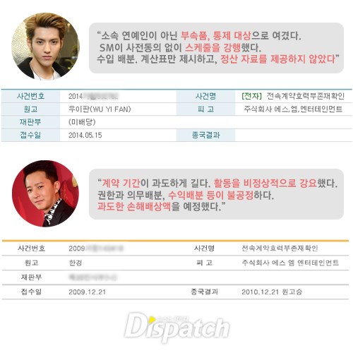[Dispatch=김수지·김미겸기자] 2009년 12월. '슈퍼주니어'의 중국인 멤버 한경이 탈퇴를 선언했다. SM엔터테인먼트에 <전속계약효력부존재확인> 소송을 제기한 것. 전속 기간과 수익 분배 등을 문제로 삼았다.