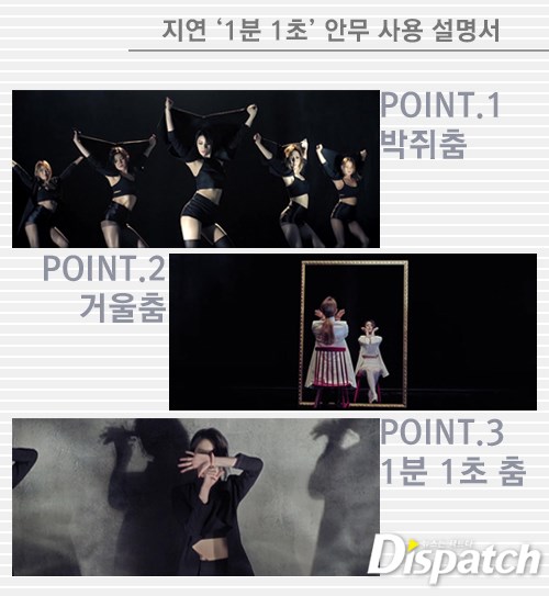 ▶ 1분 1초=제목을 형상화 한 '1분 1초'춤도 눈에 띈다. 후렴구 마지막 부분인"너 없인 숨도 쉬지 못해, 1분 1초라도"에서 등장하는 동작이다. 지연은 오른쪽 검지 손가락을 들어올렸다. 다른 손으로는 손가락을 부드럽게 감싸쥐었다.