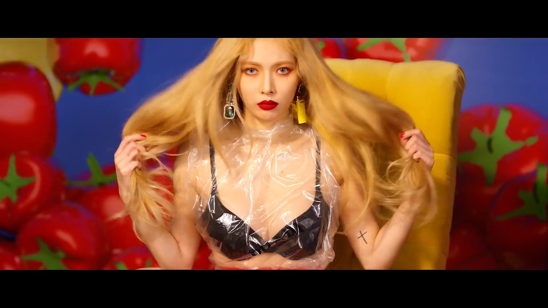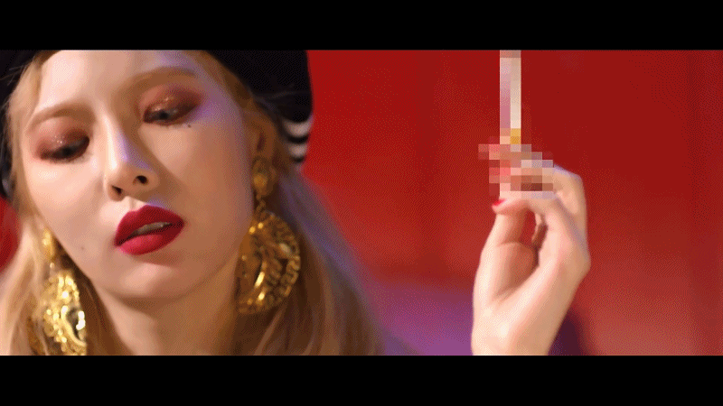 뮤직비디오는 어떨까요? 현아만의 재치가 묻어나는 장면이 많습니다. 자신의 팔뚝살을 이용해 마치 엉덩이처럼 착시효과를 주기도 했고요. 담배를 모자이크 처리한 뒤, 다음 컷에서는 감자튀김으로 보여지는 등 위트를 줬습니다.