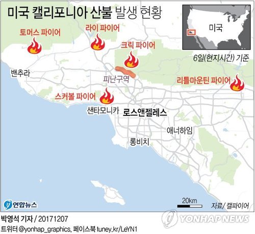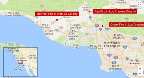 로스앤젤레스(LA) 북서쪽 벤추라에서 발화한 '토마스 파이어'가 가장 큰 규모로 번진 상태에서 건조한 강풍 탓에 소규모 산불도 여러 곳에서 발화했다.