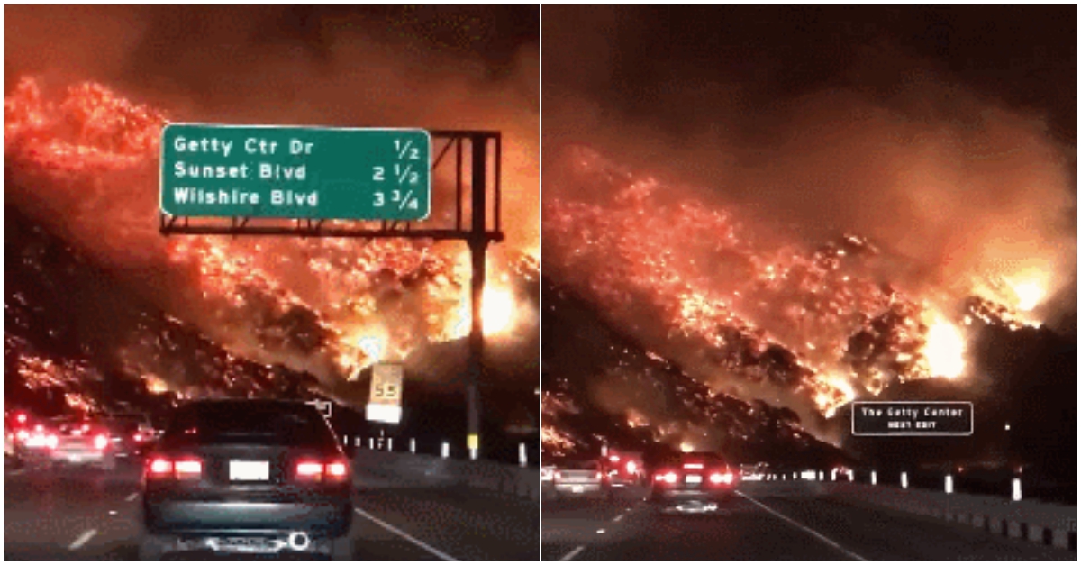 하루 교통량 40만 대 이상으로 미 서부에서 가장 혼잡한 고속도로 중 하나인 405번 프리웨이에는 산불로 날아든 잿더미가 흩날리고 있다. 이 고속도로 북쪽 방향 일부 구간이 폐쇄됐다.