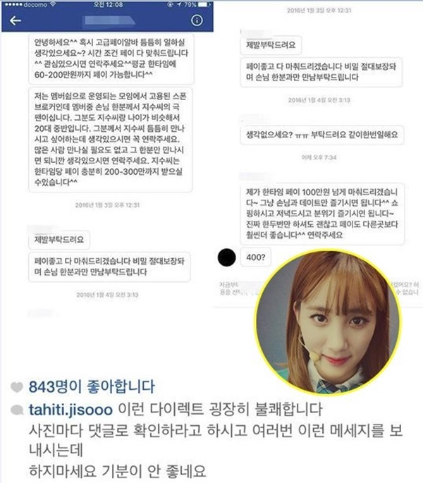 지수는 앞서 지난 1월 스폰서 제의에 불쾌감을 토로한 바 있습니다. 당시 용기있게 해당 문자를 폭로했었는데요.
