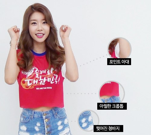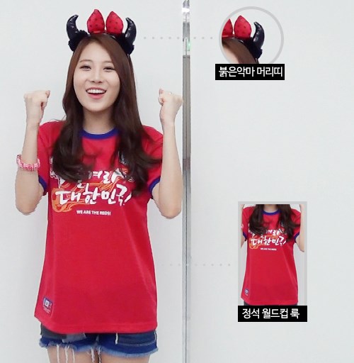 걸스데이가 붉은악마로 변신했습니다. 대한민국 국민이라면, 빨간 티셔츠는 필수니까요. 하지만 리폼은 필수입니다. 각자의 개성에 맞게~. 그럼 먼저 소진언니부터 보실까요?