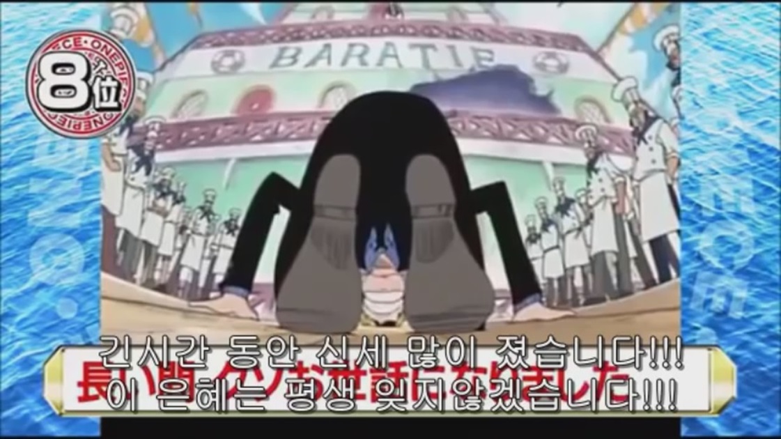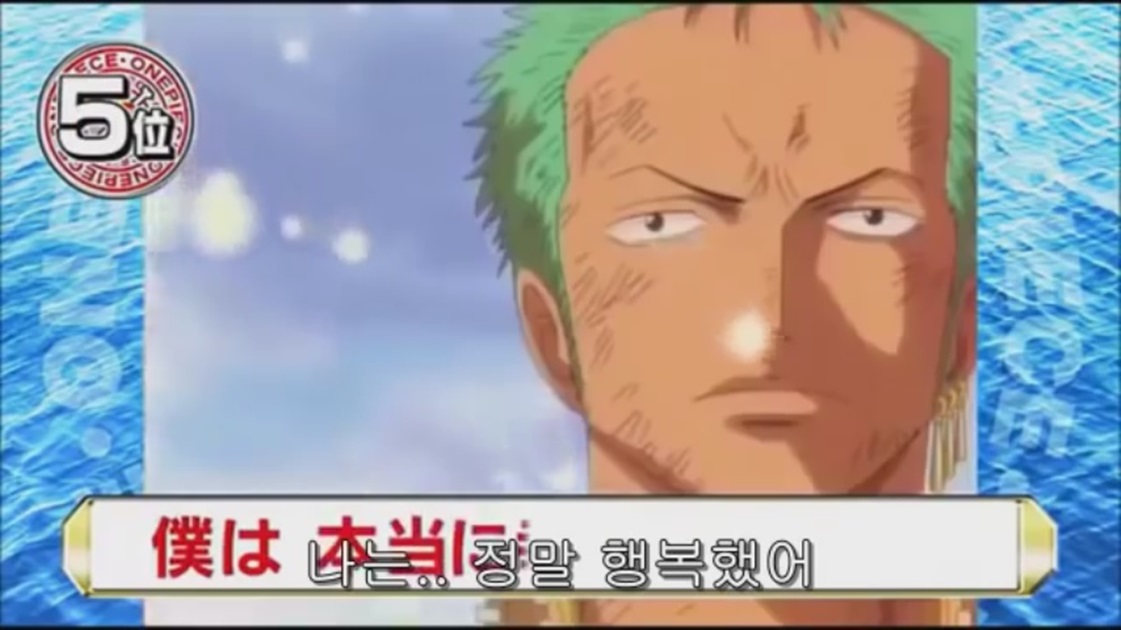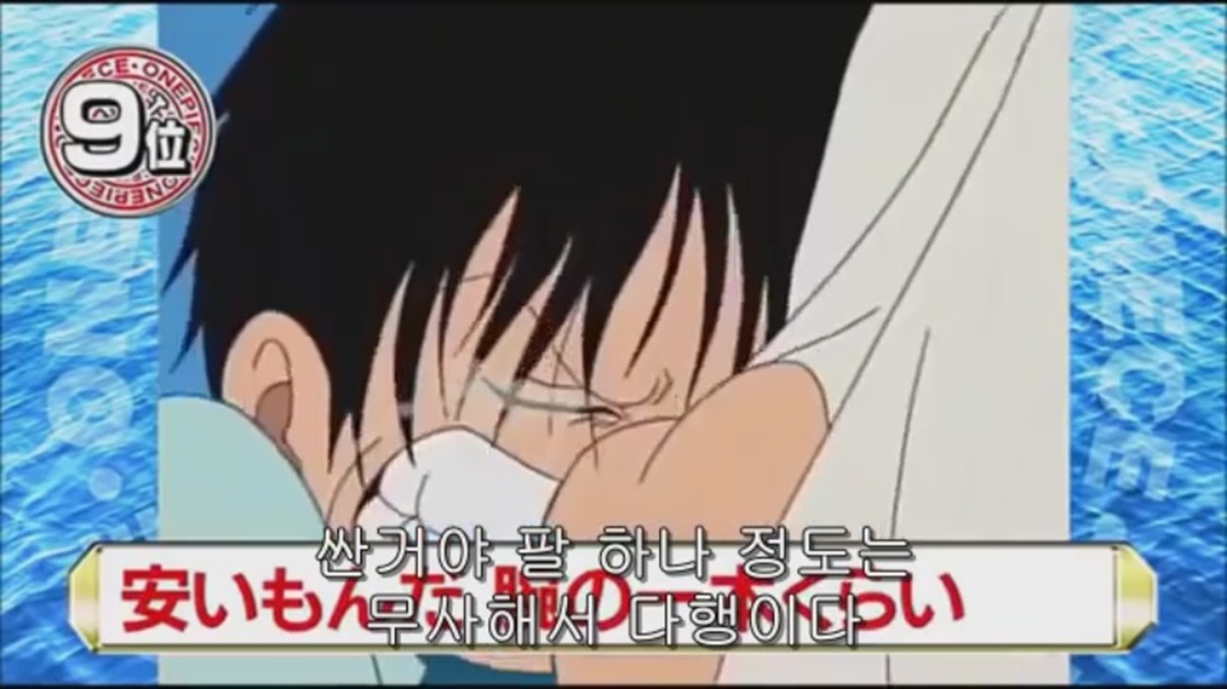 루피를 를 구하기 위하여 바다에 뛰어들어 갔다가 왼쪽 팔을 잃어버린 샹크스 그런 샹크스에게 루피가 미안해 하자 샹크스가 말한다.