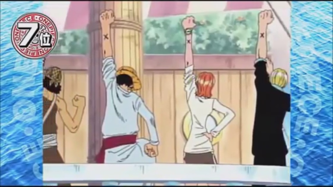 이때 루피일행은 대답 대신 동료의 표시로 왼손을 올려 X 자를 보여준다.