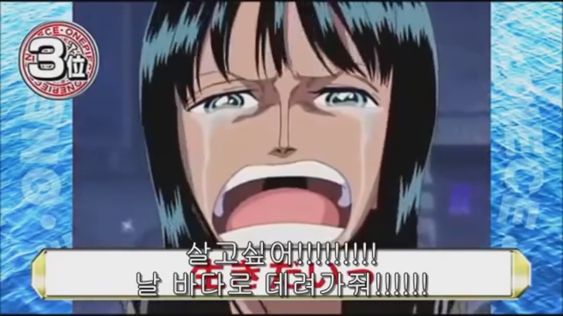 그러다 루피일행과 만나게되어 동료로 지내는 도중 세계정부에게 잡혀버리고 마는데 배신하고 버림받을게 무서워 혼자 죽음을 택했던 로빈이지만 세계정부를 적으로 돌리는 루피에게 끝내 진심을 보이고 만다.