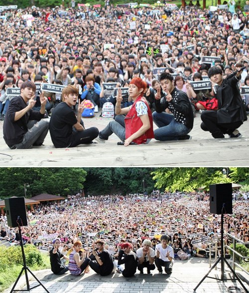 1,200명이 오매불망 기다리던 여섯 남자, 비스트가 등장했습니다. 팬들은 큰 함성으로 그들을 반겼는데요. 공원이 떠나갈 정도로 대단한 호응이었습니다.